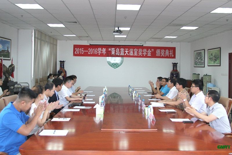 6月13日下午,“蓝天温室奖学金”颁奖典礼在八楼会议室举行,设施农业科学与工程与市场营销两个专业首批14名个人和10支小队获得“蓝天温室奖学金”奖励。烟台研究院常务副院长李兴佐、青岛蓝天温室有限公司总经理杜紫龙为在2015-2016学年赛事和企业实习过程中表现突出的同学颁发奖金。